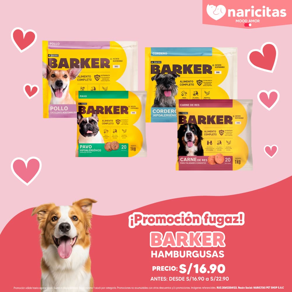 Barker Carne de Res 1Kg 20 Hamburguesas, alimento 100% natural, completo y balanceada formulado con NutraHealth. Viene en forma de Hamburguesas y aporta el 100% de nutrientes que requiere la alimentación de un perro. Es apta para todas las edades y razas desde el destete hasta perros de edad avanzada. Se recomienda servir el Alimento crudo, descongelado y a temperatura ambiente.