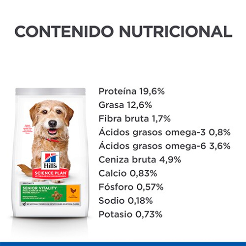 A medida que tu perro de raza pequeña envejece, sus necesidades nutricionales cambian. Hill’s Science Diet Adult 7+ Senior Vitality Small & Mini no es solo un alimento, es una fórmula científicamente balanceada para ayudar a tu mascota a sentirse más joven, ágil y conectada con su entorno. Este alimento seco completo utiliza una mezcla patentada de ingredientes que apoyan la función cerebral y la energía necesaria para mantener su ritmo de vida.