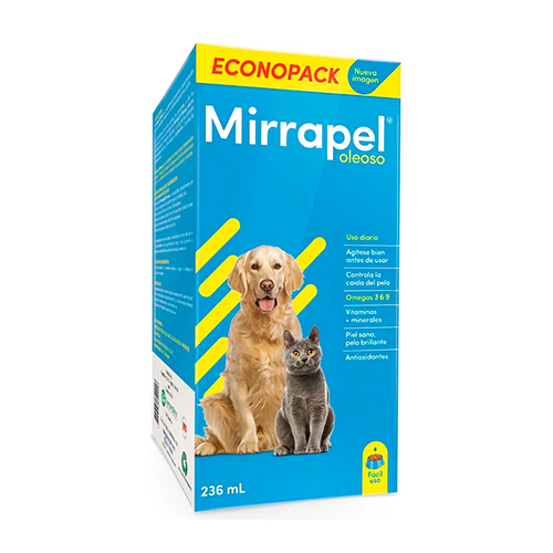 Mirrapel Suplemento Vitamínico es una emulsión oleosa de grado profesional diseñada para proporcionar una nutrición superior a la piel y el pelaje de perros y gatos. Su composición única combina ácidos grasos esenciales con protectores del hígado, vitaminas y minerales, convirtiéndose en el aliado ideal para dueños que buscan ver a su mascota radiante y saludable desde el interior.