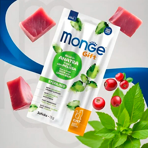 Monge Gift Sterilised con Pato y Toronjil es la solución. No es solo un premio, es un alimento complementario funcional diseñado en Italia para abordar estas tres preocupaciones clave. Formulado sin cereales y con un 81% de carne y pescado fresco (incluyendo 14% de pato), ofrece una digestibilidad superior.