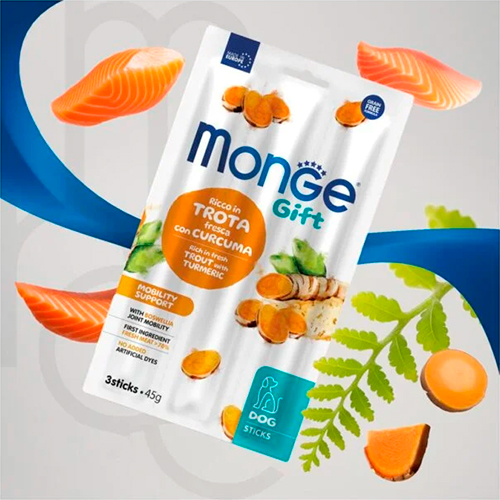 Monge Gift Mobility Support no es solo un premio, es un gesto de cuidado diario. Estos deliciosos sticks suaves, formulados en Italia, están diseñados con un objetivo claro: apoyar la movilidad y el bienestar de tu perro.