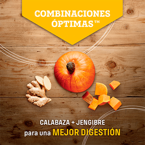 - Digestión Facilitada: Con calabaza y jengibre, ingredientes que proveen la fibra necesaria para un tránsito intestinal suave y heces firmes.